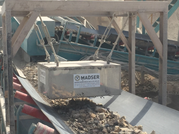 Örneğin; Gıda – Tekstil – Plastik – Madencilik – Kum- Mıcır – Çimento – Geri Dönüşüm vb. Bant üstü malzeme taşınan yerlerde (konveyör bantlar) aşağıdaki resimde de görüldüğü üzere askı şeklinde veya bandın döküş ağzına koyularak ürünün içerisine karışmış demir ve demir bileşiklerini çekmede kullanılır.
